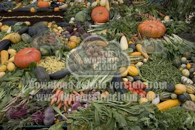• Large pumpkin fruit and vegetable display, Cider Fayre, France
