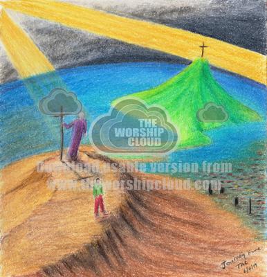 The image shows a lush green land with a cross on its heights connected buy a strip of land to a barren wasteland. Two characters stand on a hill top, one carries a cross and has grey hair, the other is a youth. One looks to the green land, the other looks upon a flooded city and a sea awash with plastic.