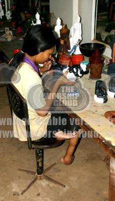 Village girl with feet disfigured by a landmine. Now learning a trade to become self supporting