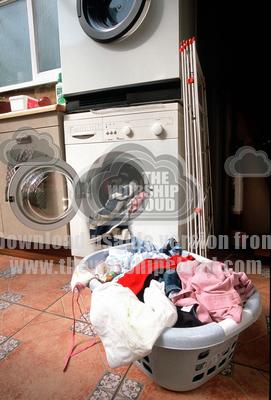 Dirty laundry waiting to be loaded into washing machine Cotswolds, UK