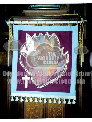 Lectern Fall for Pentecost. Created with purple material and collaged flame shapes sequins and net.The dove was made from white satin collaged on to the back ground.The pole is covered in purple cloth to match the back ground.Designed and made by Audrey Hogan