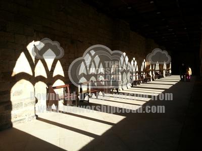 The sun shines in the cloisters at Durham Cathedral (with people in shadows)
