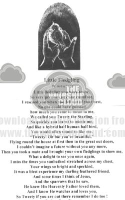 This poem and image Was created by Audrey Hogan and reproduced on Picture it programme on her computer so the words and image comprise as an image photo copy.Poem is a simple tribute to the Fledgling Starling.