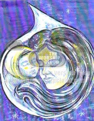 Acrylic imaginative painting of Mary in an embrace with the infant Jesus. The figures are enclosed in a tear shaped bubble against a night sky.By Audrey Hogan