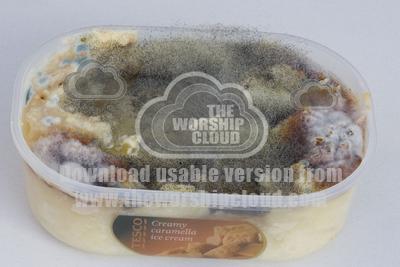 Mould or mold growing on surface of food left in plastic dish is composed of microscopic fungi whose network or mycelium covers the surface and has produced fruiting bodies or spores UK