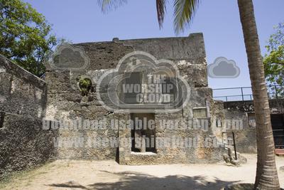Old Portuguese house in the ancient garrison of Fort Jesus now a museum in Mombasa Kenya. Located on the edge of a coral ridge overlooking the Old Port of Mombasa, Fort Jesus was built by the Portuguese in 1593 to protect their trading interests. It was designed by an Italian Jao Batisto Cairato Chief Architect for Portuguese possessions in the East Africa. The Fort is now a museum and reagarded as one of the best examples of 16th century Portuguese military architecture.