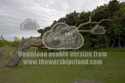 Old Scots pine tree bent by prevailing wind North Berwick, Scotland