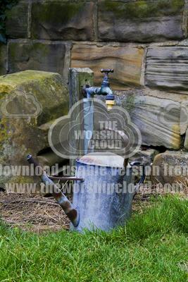 It looks as if it has seen better days this old and weathered watering can with its rust and textured patterns