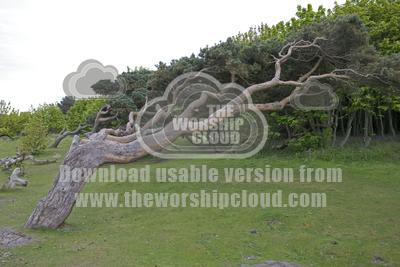 • Old Scots pine bent by prevailing wind, Berwick, Scotland