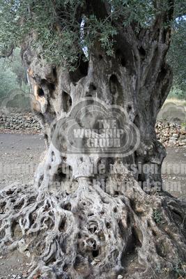 Ancient olive tree in the grounds of St Titus church at Gortys, Crete.