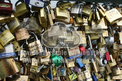 Close up of some of the thousands of padlocks that couples leave on a bridge over the Seine to demonstrate their commitment.