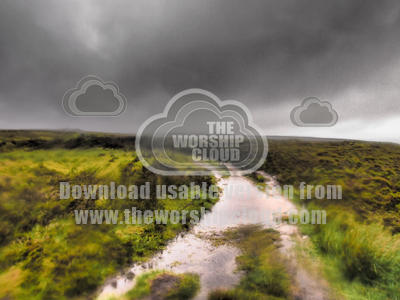 A chromatic image of a wet muddy pathway on Ilkely moor on a wet windy day.