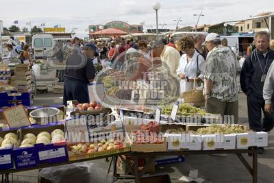 People buying fruit & vegetables at Saturday market, St Pierre sur Mer, Narbonne, southern France