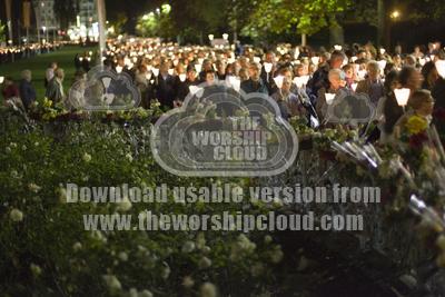 • Pilgrims in candlelight procession on rainy evening, Lourdes, Fr