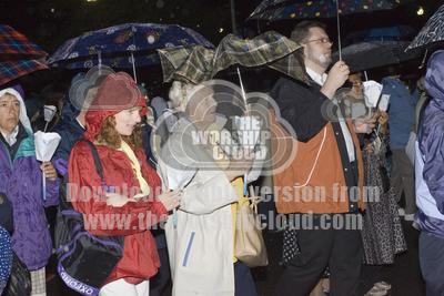 • Pilgrims in candlelight procession on rainy evening, Lourdes, Fr