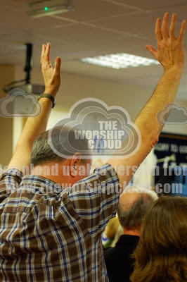 A Christian raises his hands in prayer during a Sunday service at a modern Pentecostal church.