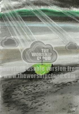 Image is based on Cuthbert's Island, Lindisfarne. It depicts a small island at low tide. The island has a cross standing upon it and sunbeams light the island. The background has sandbanks, water channels and the mainland.