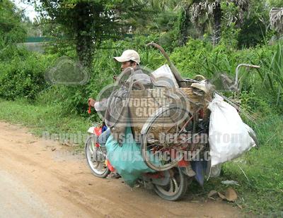 There is very little rubbish lying around in Cambodia. Most is collected by someone and re-used or sold on and recycled. Here you see the local scrapman at work, collecting anything he can find.