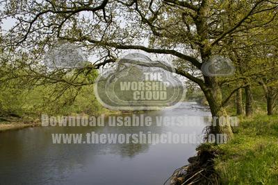 The Wharfe flows lazily between banks of trees adorned with fresh green leaves