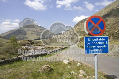Road sign Unsuitable for coaches minor road in Glencoe Achnambeithach below Bidean Nam Bian Highlands, Glencoe Scotland
