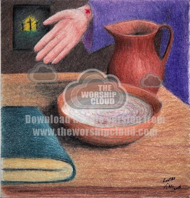 The image portrays the invitation of Jesus to take up the elements of service. Through a window is the scene of Golgotha.