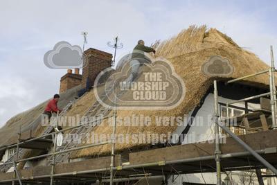 • Rural craftsmen on roof thatching cottage near Stratford UK
