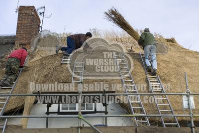 • Rural craftsmen on roof thatching cottage near Stratford UK