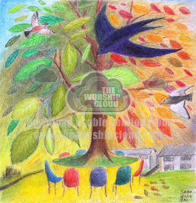 The image depicts a tree growing out of a table with chairs about it. the leaves are all different and there are birds flying about it.