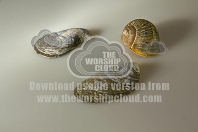 Two mussel shells and a colourful snail shell make an interesting contrast of shapes and patterns