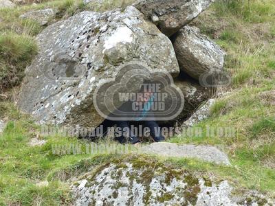Some tumbled rocks form a small cave that would provide shelter. The location is Dartmoor, walking up onto the moor from Meldon reservoir.