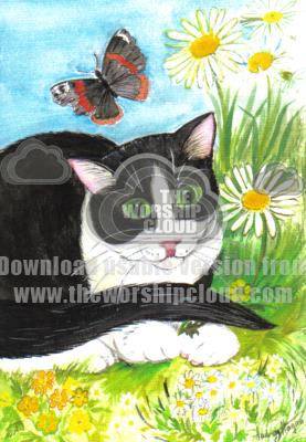 "SITTING PRETTY" Water colour painting of a black and white cat sitting among flowers with a butterfly over head. BY AUDREY HOGAN
