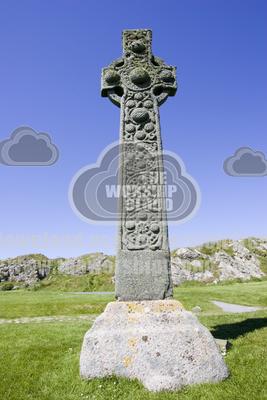St Martin's 9th century celtic cross outside Iona Abbey off south coast of Isle of Mull, Scotland, UK
