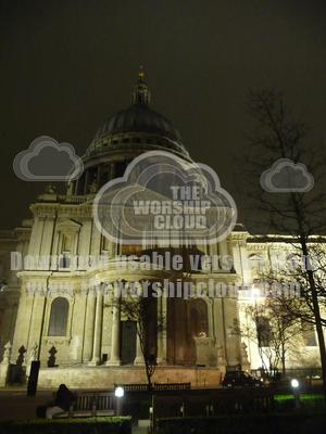 St Paul's Cathedral captured from the front, gleams at night, framed by a tree.