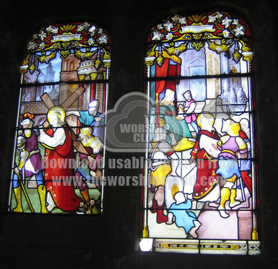 Stained glass windows in a church in Honfleur. Jesus carrying his cross to the Crucifixion.