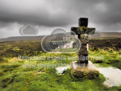 A chromatic and atmospheric image of a standing stone cross on Ilkley moor on a wet, windy and grey day.