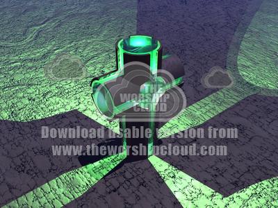 Computer generated image of a cylindrical perspex cross with internal green light, surrounded by steel plates that cover sections of the cross all of which sits on a wet clay surface.