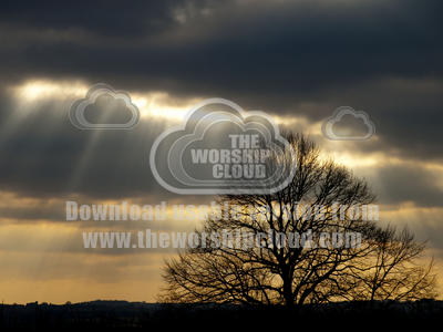 A wintry tree silhouetted against dark clouds, with sunbeams shining through