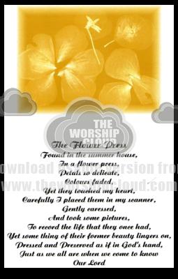 This poem has just been written after photo copying some pressed flowers. There is a spiritual side to it as well as a deep appreciation for nature.The delight in finding my flowers pressed so long ago faded and pale yet brought to life on my scanner and computer then printed. Audrey Hogan
