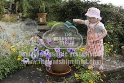 • Toddler in striped overalls watering flowers in gardenl, Micklet