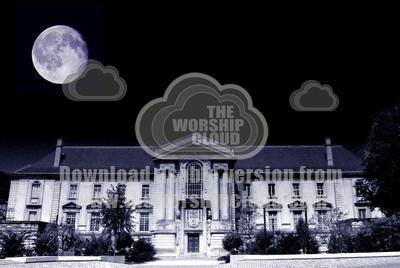 A Townhall bathed in blue moon light. Moon is full overhead