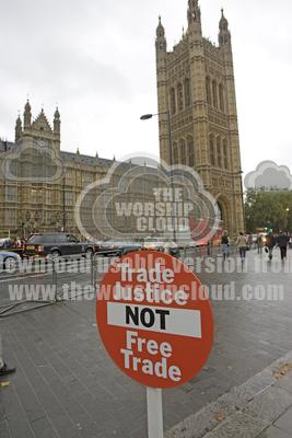 Trade Justice not Free Trade sign outside Parliament Buildings i