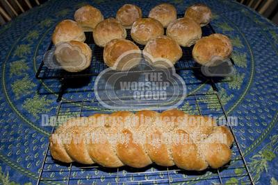 • Tray of freshly made home baked rolls and plaited loaf UK