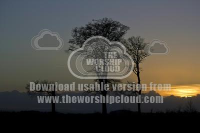 Lovely winters day sunset behind two bare trees and one stunted tree