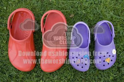 Pair of red adult croc sandals and purple child sandals on grass, These popular stylish shoes are made of soft light resin and are functional stlish and ergonomic. There has been some concerns about the fact that they can produce static electricity which might be dangerous in hospital conditions.