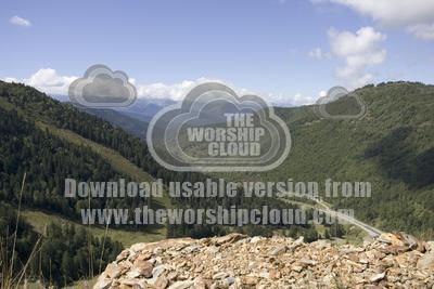 Mountainous scenery in Pyrenees with confierous forest and sheep south of Lourdes, southern France