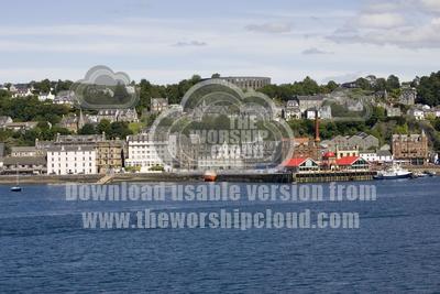 View of houses and hotels in town of Oban along quayside from harbour, Scotland, UK