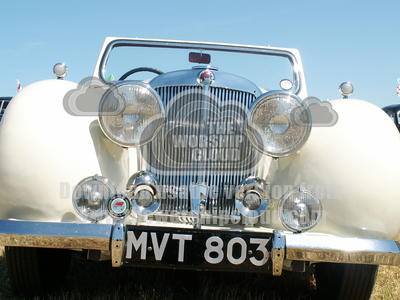 Front of White Vintage car showing chrome radiator and lights