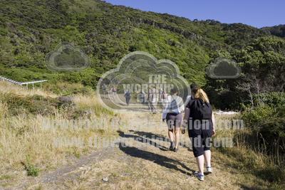 Visitors walking up to information centre Kapiti island near Wellington New Zealand