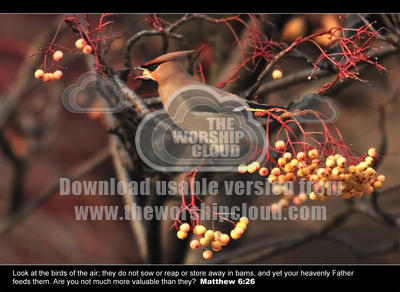 Look at the birds of the air; they do not sow or reap or store away in barns, and yet your heavenly Father feeds them. Are you not much more valuable than they?