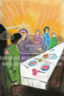 This image depicts Christ or a Christian welcoming a stranger, a homeless person, the poor, to the table. Inspired by the parable of the banquet.